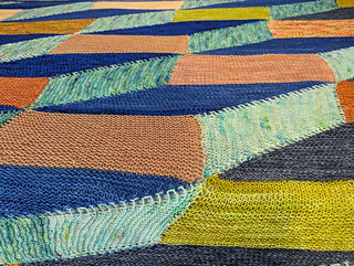 The blanket is worked in garter stitch with increases and decreases for shaping. Only one block is worked at a time, but some blocks transition directly into the next, while others are bound off. Stitches are then picked up along the sides to create the next blocks.