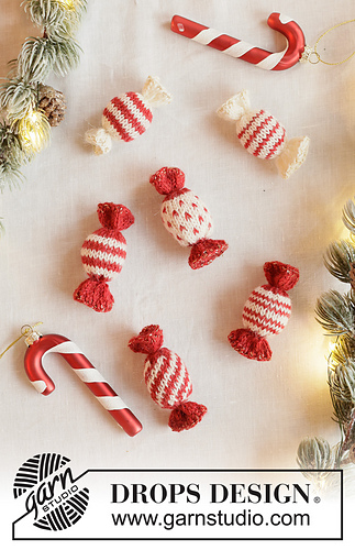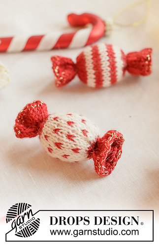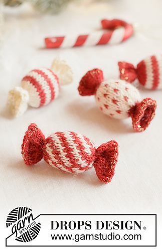 Knitted bonbon/sweet/Christmas decoration in DROPS Flora and DROPS Glitter. The piece is worked from side to side in stocking stitch, with stripes and Nordic pattern. Theme: Christmas.