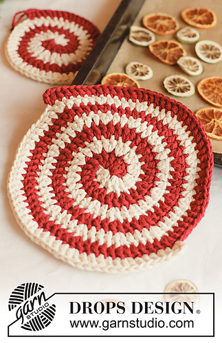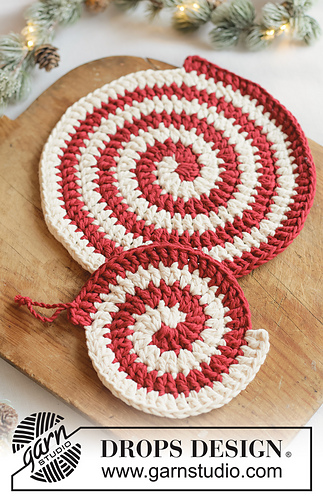 Crocheted trivet and pot holder in 2 strands DROPS Paris. Piece is worked in a spiral with 2 colours. Theme: Christmas.