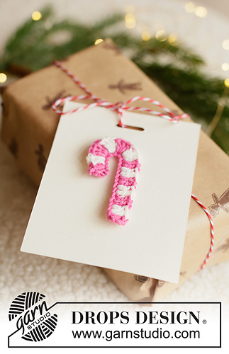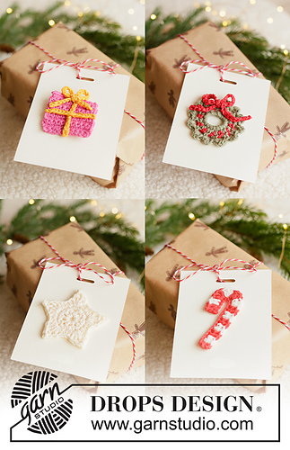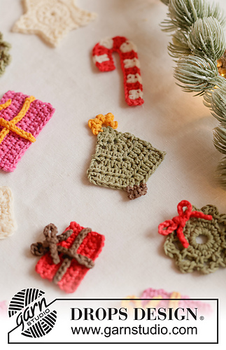 Crocheted Christmas decorations/parcels, sugar cane, Christmas tree, wreaths and stars in DROPS Safran. Theme: Christmas.