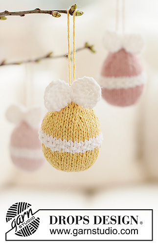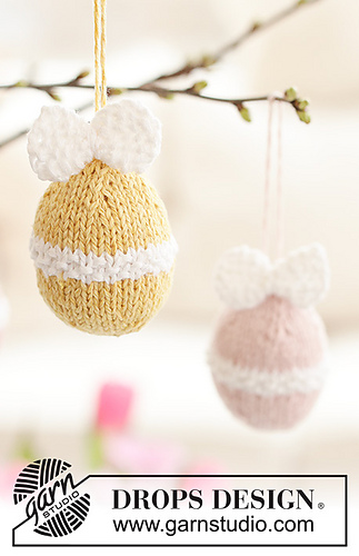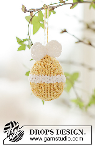 Knitted Easter egg in DROPS Belle. The piece is worked bottom up in stocking stitch and moss stitch, and with a bow. Theme: Easter.