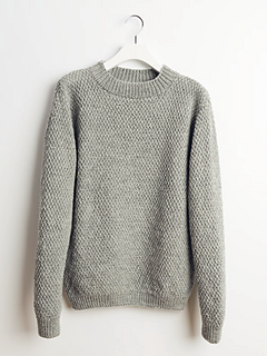 Der Pullover mit eingesetzten Ärmeln wird in Einzelteilen flach im grolßen Perlmuster gestrickt. Das Halsbündchen wird ebenfalls flach gestrickt nachdem eine Schulternaht geschlossen wurde, die andere Schulternaht wird zsammen mit dem Halsbündchen zum Schluß geschlossen.