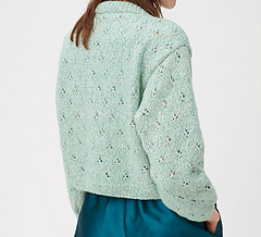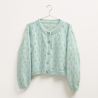 Taillenkurze Ajourmuster-Jacke mit Rippenbündchen am Saum und Ärmel, in Einzelteilen vom Bundaufwärts gestrick Die vorderen Blenden mit Knpfloch werden gleich mitgestrickt. Die Halsblende im Rippenmuster und mit Knopfloch wird zur Hälfte nach innen umgeschlagen und festgenäht.