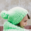 Pom pom hat made on circular needles with 1 ball of neon coloured yarn.