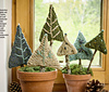 Die Tannenbäumchen sind glatt und kraus rechts, im Perl- und Rippenmuster in Runden gestrickt. Verziehrungen werden mit Platt- und Stielstichen sowie im Margeritenstich aufgestickt.