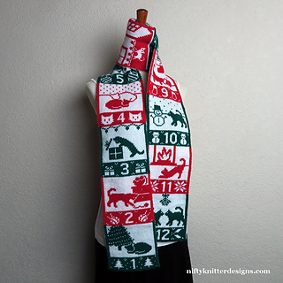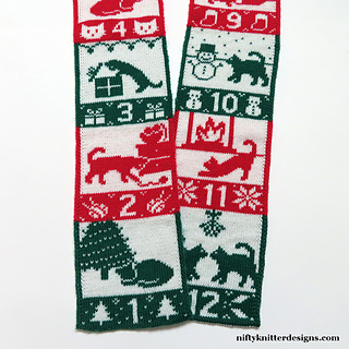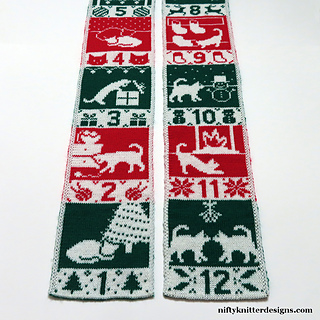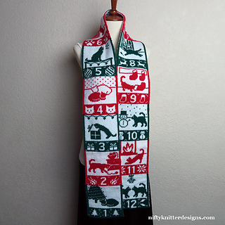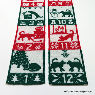 Double knit, the scarf is designed for three colors (a main color and two contrasting colors) and is reversible, featuring opposite color schemes on each side. The design is somewhat similar in layout to several of my other MKAL scarves, such as Meowy Christmas Scarf. Since numbers are included for the 12 cats, small sections of the scarf include optional non-mirrored double knitting.