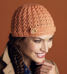 “A close-fitting beanie with a garter-band detail is worked in a fetching eyelet-lace pattern.”