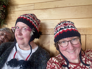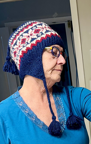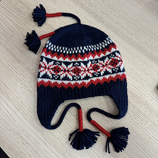 The hat is started by making two earflaps which begin with i-cord (see photo). The earflaps are joined by casting on additional sts between the earflaps. The hat continues with ribbing and then stranded knitting. The earflap ribbing should flow right into the hat ribbing. See earflap photo.