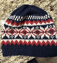 Worsted weight yarn in dark navy, bright red, and winter white. Small amounts of red and white are used so one skein can make ~4 hats. Two skeins of navy will make three hats.