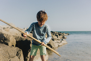 Divide work for sleeves, back and front. Work back and front in rnds and end with ribbing. Work sleeves in rnds and end with ribbing. Work garment with stripes according to diagram.
