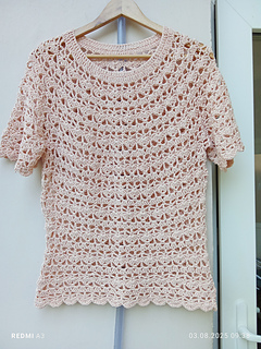 Crocheted top in DROPS Muskat. Piece is crocheted top down with round yoke and lace pattern. Size: S - XXXL