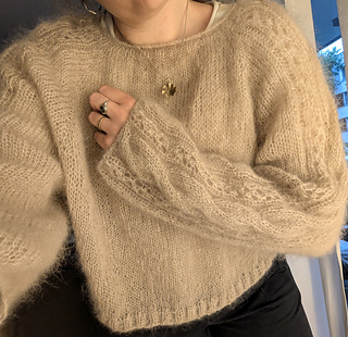 Knitted jumper in 2 strands DROPS Kid-Silk. The piece is worked top down with raglan, cables and lace pattern. Sizes S - XXXL.