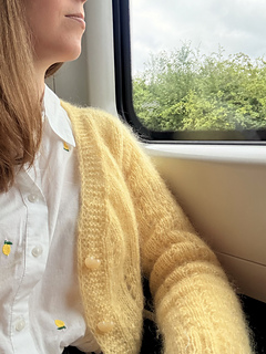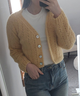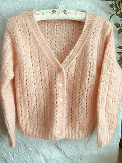 Knitted jacket in 3 strands DROPS Kid-Silk. The piece is worked bottom up with lace pattern, V-neck and I-cord. Sizes XS - XXL.
