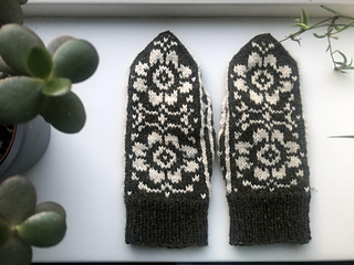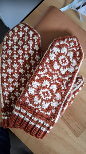 23 stitches in width and 32 rows in height, with Nordic pattern on needle size 3 mm = 10 x 10 cm.