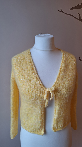 Knitted jacket in DROPS Brushed Alpaca Silk and DROPS Flora. The piece is worked top down with raglan, V-neck, rolled edges and I-cord. Sizes S - XXXL.