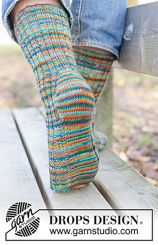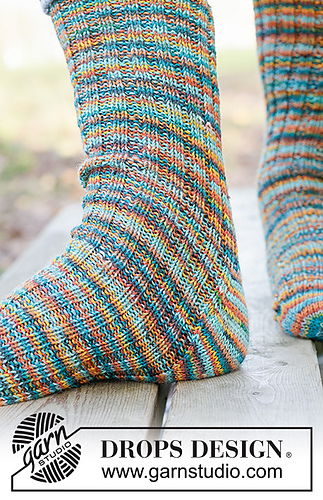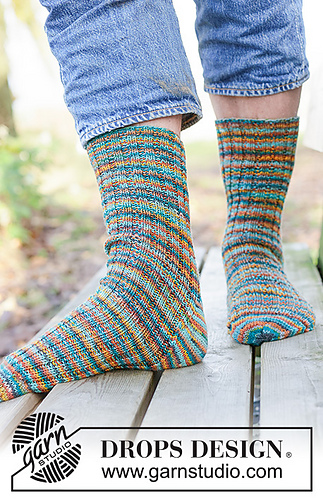 Knitted socks in DROPS Fabel. Piece is knitted top down with rib and diamond heel. Size 38 - 46