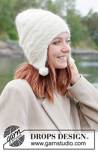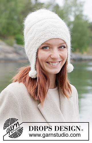 Knitted hat with earflaps in DROPS Lima and DROPS Kid-Silk, or DROPS Merino Extra Fine and DROPS Kid-Silk. The piece is worked bottom up with relief-pattern.