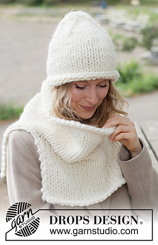 Knitted hat and neck warmer in 1 strand DROPS Polaris or 2 strands DROPS Snow. Piece is worked in stocking stitch.