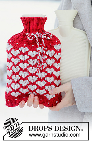 Knitted hot water bottle cover in DROPS Merino Extra Fine. The piece is worked bottom up in stocking stitch with Nordic pattern and hearts. Theme: Valentine.