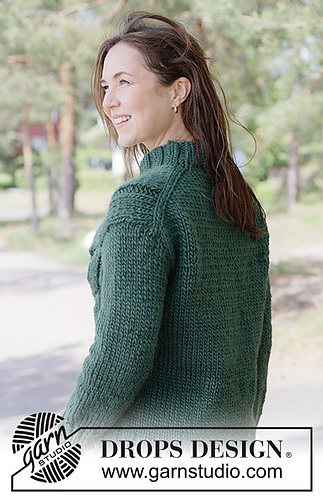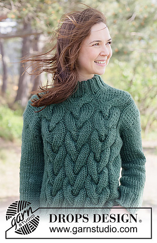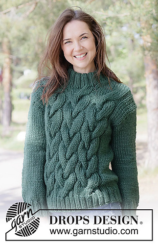Knitted jumper in DROPS Snow. Piece is knitted top down with diagonal shoulder / European shoulder, cables and double neck edge. Size XS – XXXL.