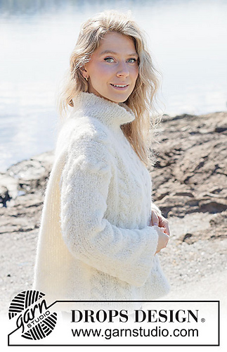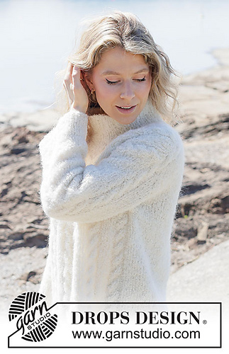 Knitted over-sized jumper in DROPS Alpaca Bouclé and DROPS Kid-Silk. The piece is worked top down with diagonal/European shoulders and cables. Sizes XS - XXXL.