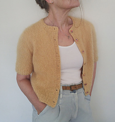 Knitted jacket with short sleeves in 1 strand DROPS Melody or 2 strands DROPS Brushed Alpaca Silk. Piece is knitted top down in stocking stitch with European yoke. Size XS – XXXL.