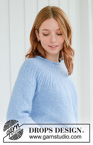 Knitted jumper in DROPS Air. Piece is knitted top down with round yoke, relief pattern and I-cord. Size XS – XXXL.