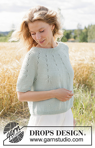 Knitted jumper in DROPS Cotton Merino or DROPS Belle. The piece is worked top down with round yoke, lace pattern on the yoke and short sleeves. Sizes XS - XXXL.