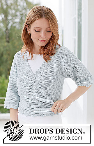Crocheted jacket with ¾-length sleeves in DROPS Belle. The piece is worked top down with wrap-around, treble crochets, fan-edges and tie-bands. Sizes XS - XXXL.