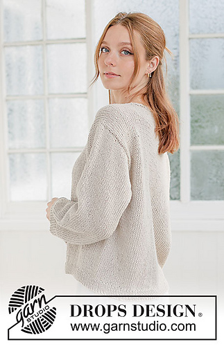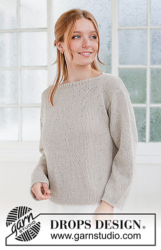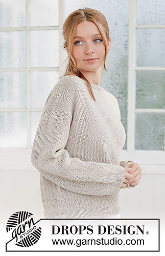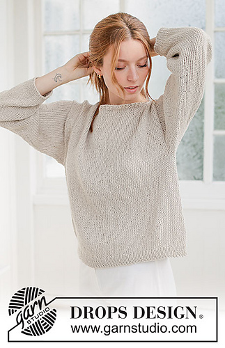 Knitted jumper in DROPS Bomull-Lin. Piece is knitted top down in stocking stitch with boat neck and diagonal shoulder. Size XS – XXXL.