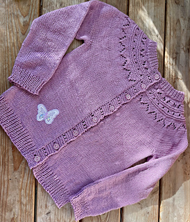 Knitted jacket for children in DROPS Karisma. The piece is worked top down with round yoke, lace pattern and double neck. Sizes 2 - 12 years.