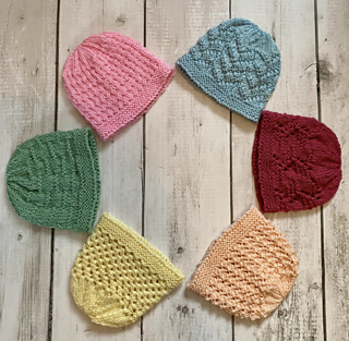 This knitting pattern is a collection of 6 hats for a newborn baby. The beanie style hats will fit to approx 3 months depending on baby size.