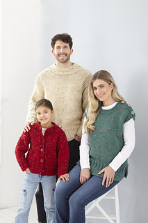This pattern provides instructions for a sweater, cardigan and top, knitted in King Cole Super Chunky yarn.