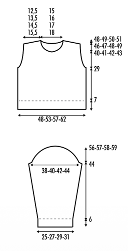 This garment consists of a back piece, a front piece, and two sleeves. Pieces are seamed together and neckband is picked up to complete the garment.