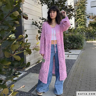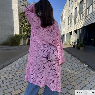 The Extra Fine cardigan by Atty van Norel (@attysloveforcrochet) is a long crochet garment made from large geometric squares. Light, modern and perfect for mid-season wear, it is designed to be worn open and pairs easily with simple outfits.