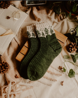 A Journey Away socks are worked cuff down. They have a forest-themed colourwork scenery on the leg and texture running all the way to the toes. The pattern features a textured contrast colour french heel. The pattern is written for magic loop, but can easily be worked with dpns. There are two versions of charts included, one better for screens and another for printing.