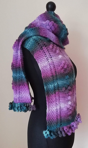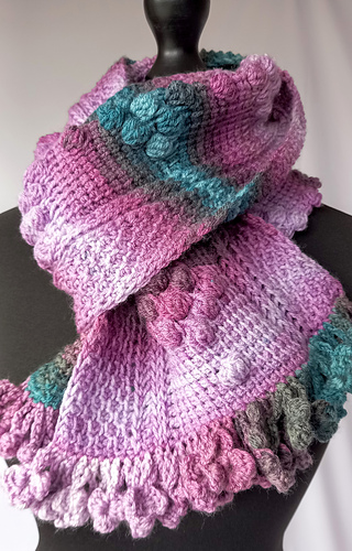 Worked in two balls of Hayfield Spirit DK, the scarf showcases the yarn’s natural colour transitions while keeping the stitchwork clean and elegant. The length is simple to customise—just add extra repeats for a longer finish. The optional flower fringe adds a playful touch if you’d like a little extra flair.