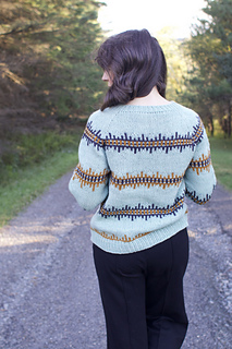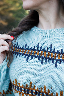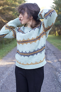 Acoustic Sweater is worked from the top down, in the round, seamlessly. Raglan increases in the yoke make for a well-fitting garment. Colorwork sections throughout the pattern make the project exciting, with stockinette breaks in between allowing for relaxing knitting. The colorwork is easy to memorize, only ever 2 colors at a time and short floats - perfect for colorwork beginners!