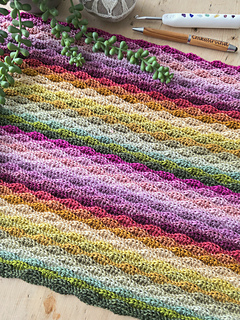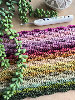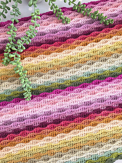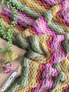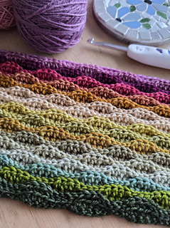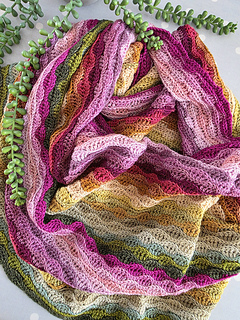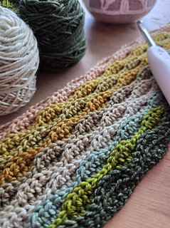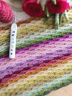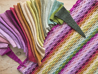 Worked in the almond stitch, it highlights gentle colour changes while creating a beautifully textured fabric. The result is a cosy scarf that drapes softly and showcases each mini skein as it flows into the next.