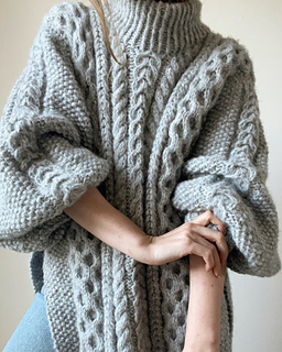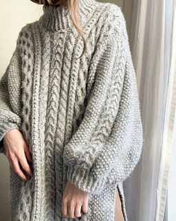 Aegyo Dress is worked top down with cables on front and sleeves, slits along both sides and can be worn on top of pants or a dress.
