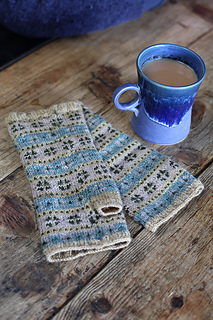 The Agatha mitts are knitted from the cuff in the round, using a repeating stranded colourwork motif, which is worked from a chart. Thumb stitches are placed on waste yarn whilst the upper hand section is worked. Finally, the thumb is knitted to finish. This simple pattern with a repeating motif is perfect for knitters new to colourwork or for a more experienced knitter who desires a simple knit to work on.
