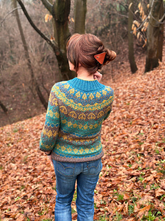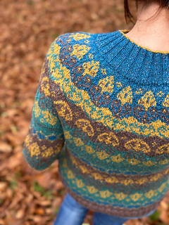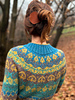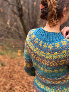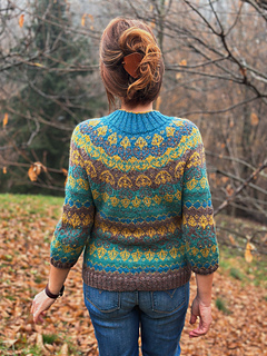 Aki No Mori is a top-down, circular yoke pullover that is made using 4 colors with stranded colorwork on the yoke, body and sleeves.