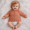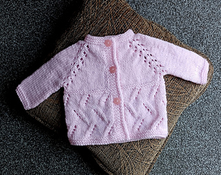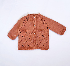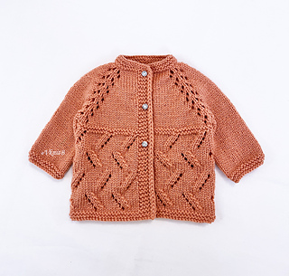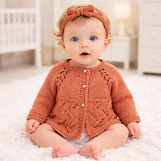 This sweet baby cardigan pattern is knitted seamlessly from the top down, showcasing a delicate lace raglan detail. The body is worked flat, while the sleeves are completed in the round for a neat and refined finish. An easy-to-follow lace pattern adds subtle texture and charm, making the project both enjoyable to knit and beautifully elegant once finished.