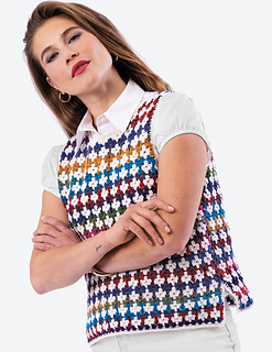 striking (and surprisingly simple) diamond stitch utilizes double crochet clusters, with edgings worked in rounds of single crochet. Side slits lend the vest an entirely modern silhouette.
