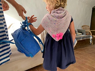 This sweet little shawl was originally designed for my grandniece, Alma! It is a simple triangular, garter stitch shawl knit in a fun, speckled fingering merino and embellished with neon mini-pompoms for fun!