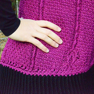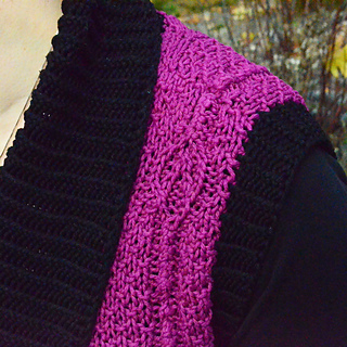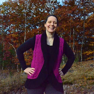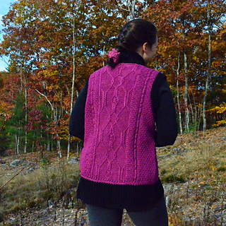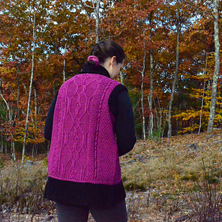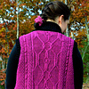 Almost Home vest features a few of the optional design modifications, most dramatically, the option for less of a slope on the short rows in the lower body, which you can also apply to the sweater. The vest features a sleeve trim rather than full sleeves. Almost Home vest was knit in two solid colors, which highlight the cabling and textured stitch pattern in a different way than the speckled yarn of the sweater version.