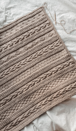 Laddered sections echo cobblestone pathways, while dotted textures glisten like morning dew across windswept fields of wildflowers, and weathered pasture gates. Each section invites slow craftsmanship and mindful knitting, resulting in a richly textured heirloom blanket meant to comfort and honour tradition.