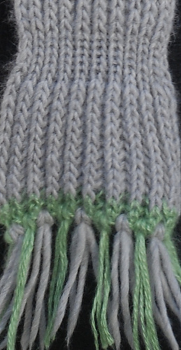 Brioche stitch gives the scarf its lofted, reversible face. The colour blocks alternate between a silvered Alpaca Quito grey and a muted Mohair Silk green, reading as one tone from a distance and two up close.