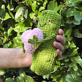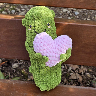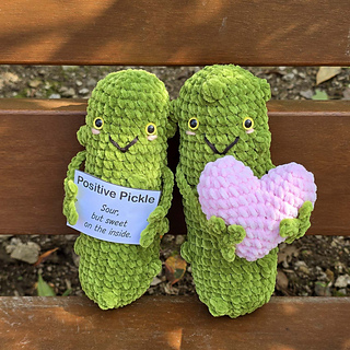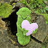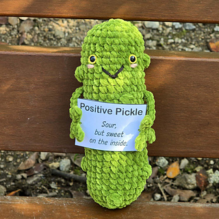 This crocheted positive pickle is approximately 18 cm (7 inches) tall by 6 cm (2.4 inches) wide.