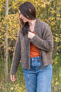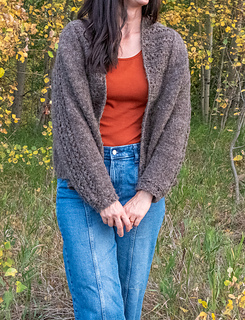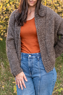 This cardigan is worked from the top down with a contiguous set-in-sleeve. The shoulders are constructed by casting on the back stitches, saddle shoulder stitches and 1 stitch for each front, then increasing rapidly for each of the back and fronts. The shoulders are worked in lace rib and not increased. However, short rows are placed within the shoulder sections, in pattern. Once the shoulders are shaped, they are put on hold and the yoke is split for both fronts and back, which are worked separately, flat to the armhole depth. These sections are then joined to form the body which is worked even to the hem. The sleeves are picked up, including the lace saddle shoulders, and decreased to the cuff. The shawl collar is picked up along the entire front edges and back neck, and worked in the lace pattern, including wrap and turn short rows in pattern to create depth along the back neck.